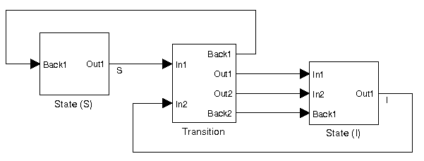 shows the translation of the simple SI petri net, with two states and one transition block. The states are just integrators preceded by sums: