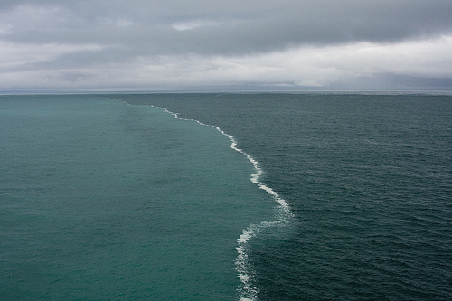 He believes this was caused by fresher water meeting more salty water, but it doesn’t sounds like he’s sure. Can anyone figure out what’s going on? The foam where the waters meet is especially intriguing.