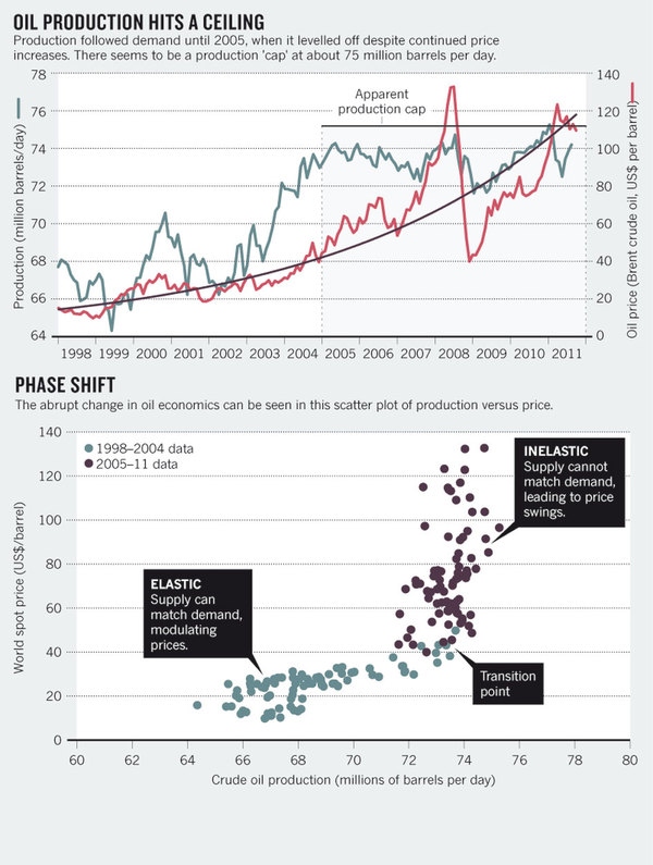 In 2005, global production of regular crude oil reached about 72 million barrels per day. From then on, production capacity seems to have hit a ceiling at 75 million barrels per day. A plot of prices against production from 1998 to today shows this dramatic transition, from a time when supply could respond elastically to rising prices caused by increased demand, to when it could not (see ‘Phase shift’). As a result, prices swing wildly in response to small changes in demand. Other people have remarked on this step change in the economics of oil around the year 2005, but the point needs to be lodged more firmly in the minds of policy-makers.