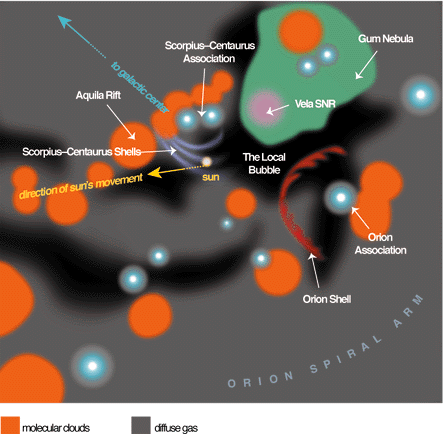 The Local Bubble is a bubble of hot interstellar gas 300 light years across, probably blasted out by the supernova called Geminga near the bottom of this picture.