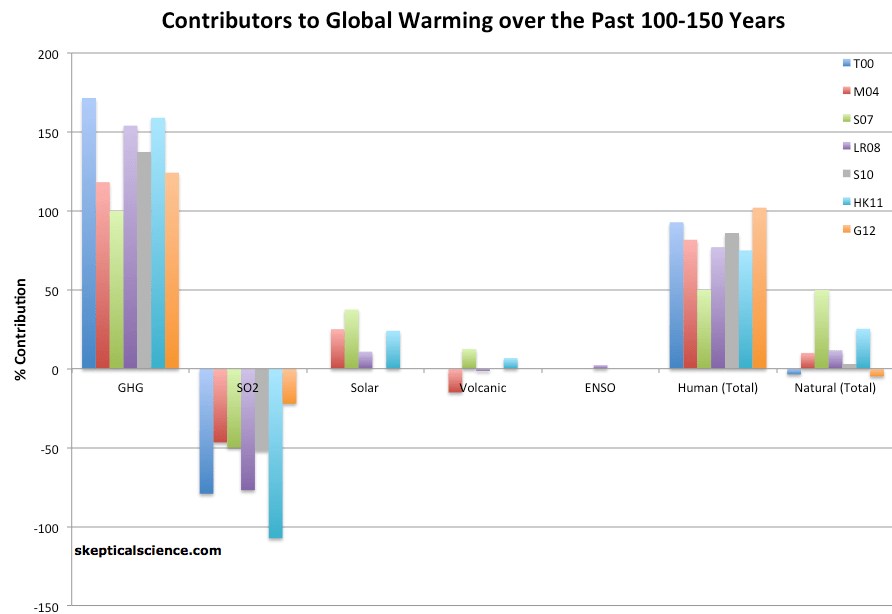 The point is that human sulfur dioxide (SO2) emissions have a cooling effect, while greenhouse gases (GHG) have a warming effect. So, it seems roughly 100–170% of global warming is due to our greenhouse gases, mainly CO2. Click the figure for more details.